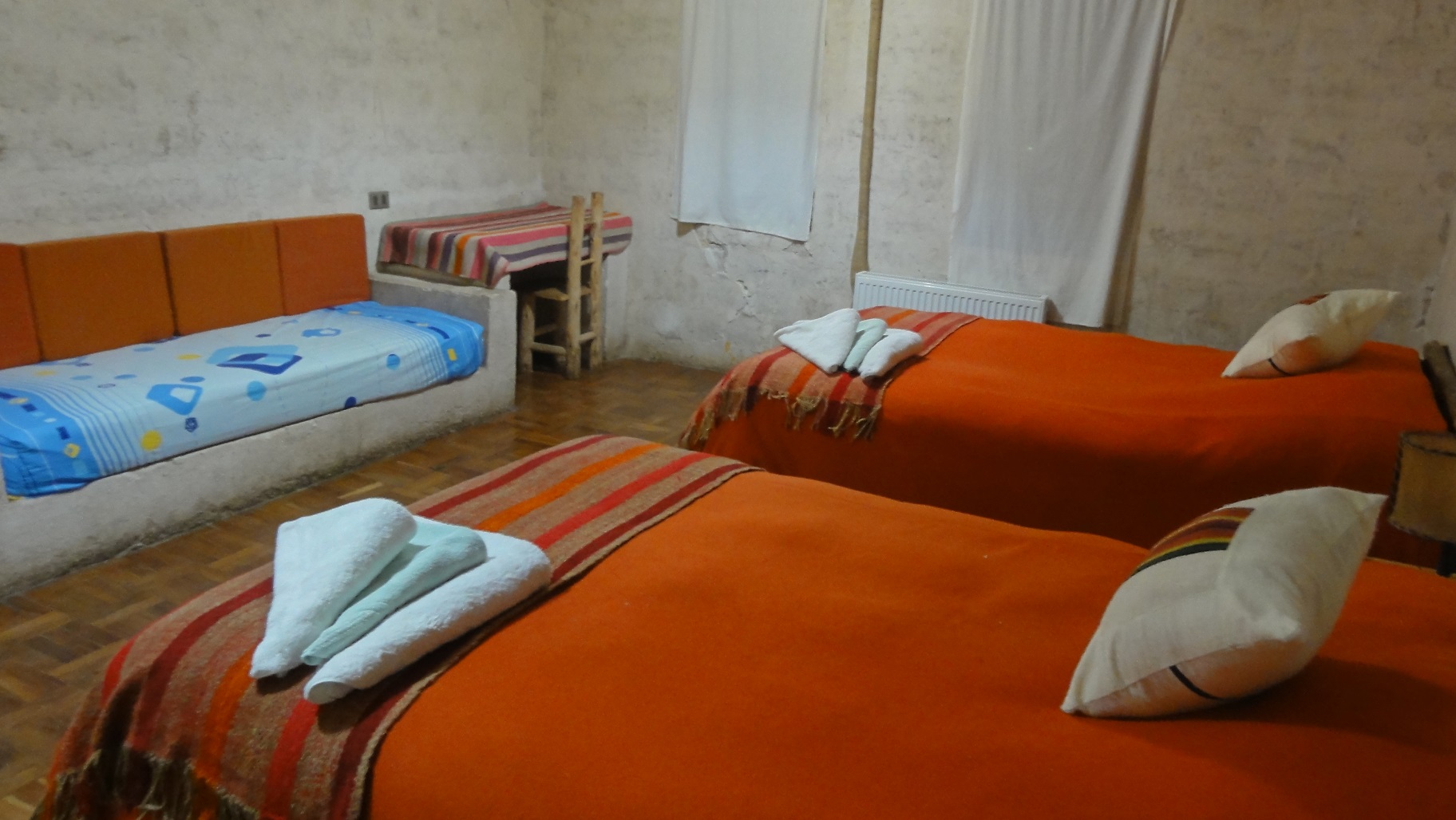 食堂はけっこう広く、またボリビアの高地は全体にそうなのだが、塩湖周辺は特に、夏でも夜は寒いので暖炉があったりして、いい感じ。